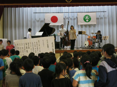 今日は、音楽鑑賞会が行われました。クラリネットの川畑麻衣子様、ピアノの佐合庸太郎様、ドラムの坂本暁良様、コントラバスの古賀圭侑様の4名をお迎えし、プロの演奏を子供たちは鑑賞することができました。