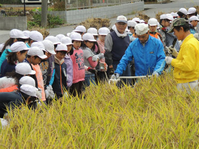 5年生は、6月に植えた稲の稲刈りを行いました。子供たちにとって稲を刈るのは初めての体験でしたが、わかりやすく教えていただき、自分たちで育てたコメの収穫ができました。11月4日の給食では、自分たちの育てた赤米が出ます。いつもに増しておいしい給食になると思います。ご指導いただいた皆様、大変ありがとうございました。