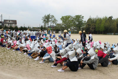 <地震が起きた時には、防災ずきんをかぶり机の下に隠れます>