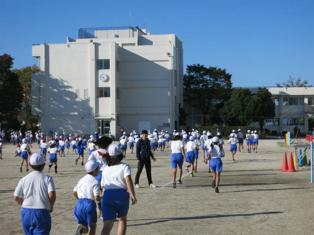 晴天のもと、子供たちは元気に5分間走に取組みました。16日に行われる持久走記録会では、練習の成果を発揮できることを願っています。