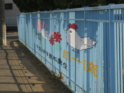今日は6年生が校庭東側のフェンスに、本校の花のコスモスと、今年の干支の酉の絵を描きました。フェンスの鉄柵1本1本に色を付けていきます。正面からでは何かわからないのですが、斜めから見ると大きなひとつの作品となります。この作品作りには、昨年度、本校西側のフェンスアートをしていただいた飯山様と小保方様にご指導いただきました。強風の吹く中でしたが、子供たちは、一生懸命作品作りに取り組むことができました。飯山様、小保方様、朝早くからのご指導ありがとうございました。
