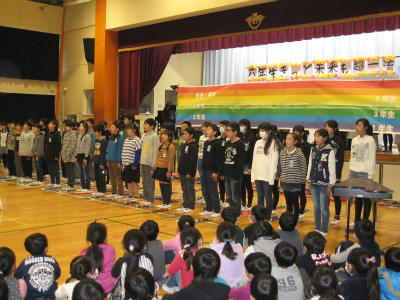 6年生を送る会 投稿日時 : 2017/03/06 豊野小 カテゴリ: 今日は、「6年生を送る会」がありました。今までお世話になった6年生に下級生が心を込め、歌や演技などを発表しました。下級生の一生懸命な姿に6年生もとても感激していました。 6年生今までお世話になりました。中学生になっても自分の良さを発揮し活躍してください。