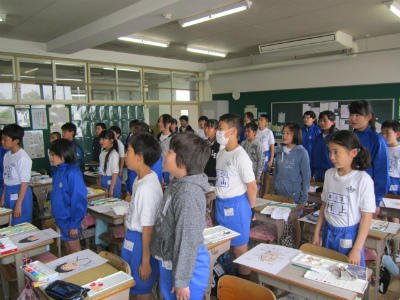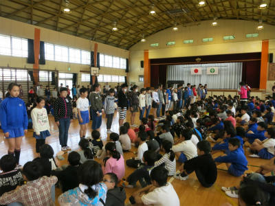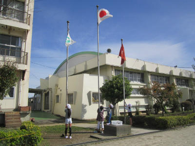 登校すると、すぐに高学年の児童が、昨日の入学式会場を片付けたり、マットの用意や国旗等を掲揚したりしてくれました。頼りになります。