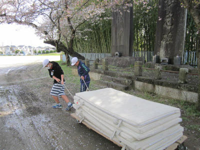 重いマットをぬかるみに負けず運んでいます。がんばりました。