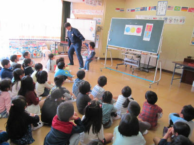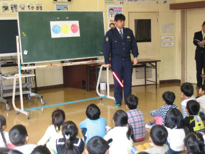 信号機の秘密や安全な道路の渡り方など、警察官の富田さんの話に、子供たちは真剣そのものです。