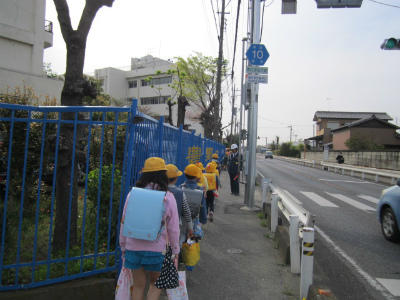 入学式から一夜明けて、今日から可愛い1年生が、一緒に登校します。保護者の登校ボランティアが、安全を見守ってくださっています。