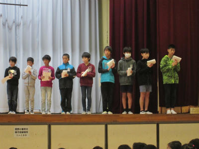 12月の全校朝会の前に、6年生が先日のスーパー元気さわやか集会の作文を発表しました。