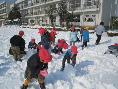 業間休み、雪で遊ぶ子供たちとそれを見守る教師。でも・・・、寒いせいか、遊ぶ子が少ないです。