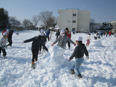 自分たちで校庭に作った雪だるまを邪魔にならないように壊しています。