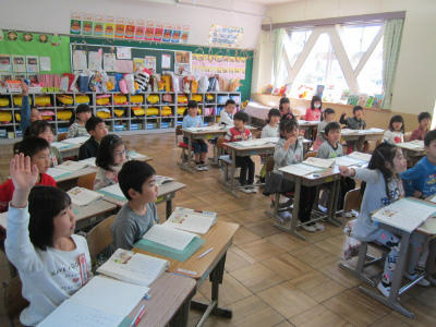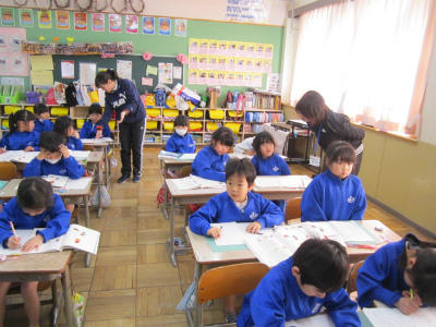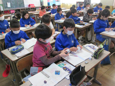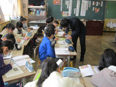 1年生が、入学式で入学児童に発表する「在校生歓迎の言葉・校歌紹介」の最後の練習を行いました。