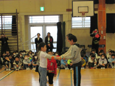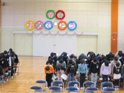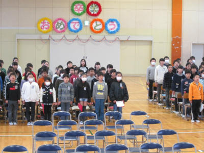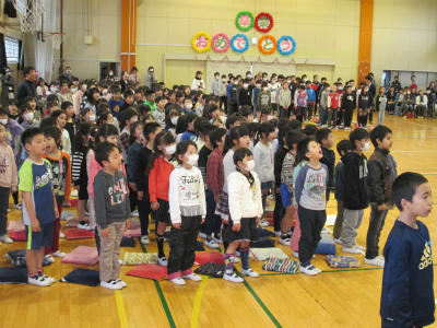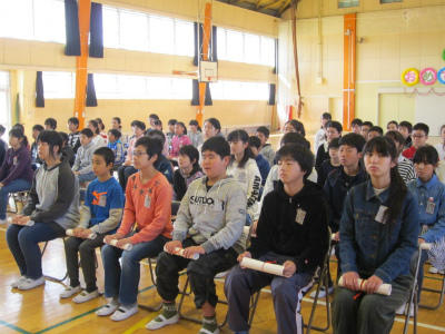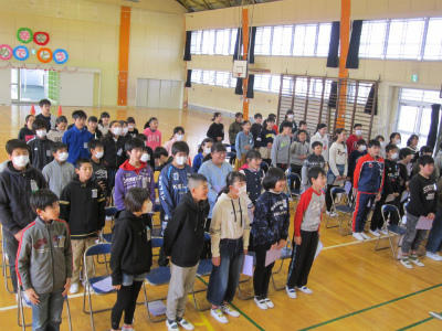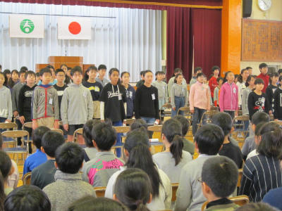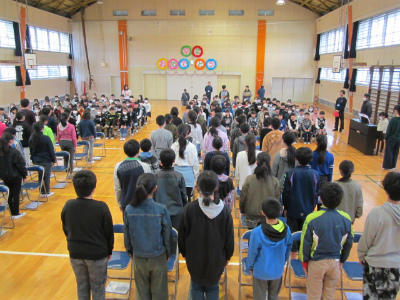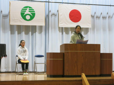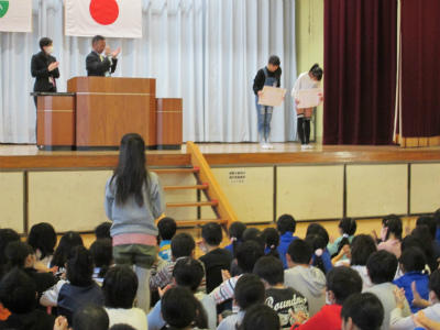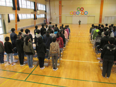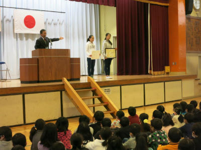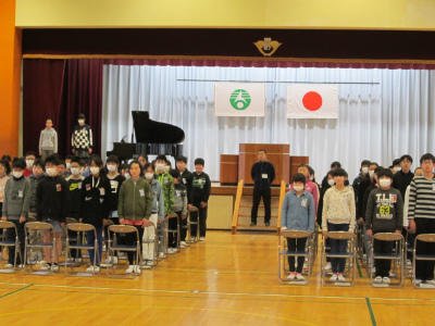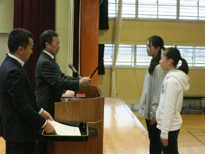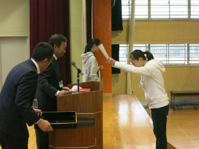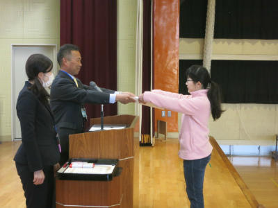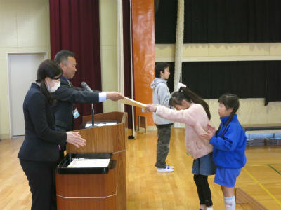 第3学期の修了式が行われました。代表児童が、修了証を壇上で受け取ります。