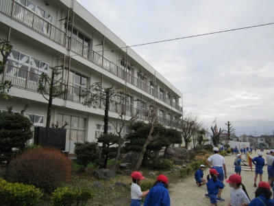 雨上がりの正門で、豊野小元気にあいさつし隊があいさつ運動をしています。