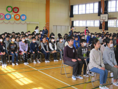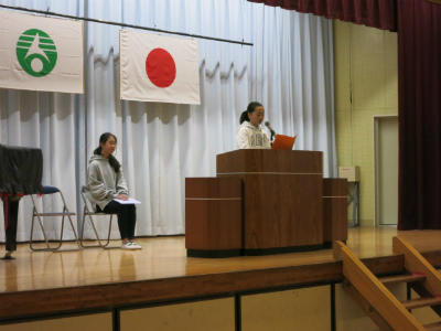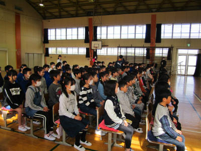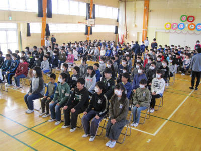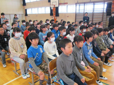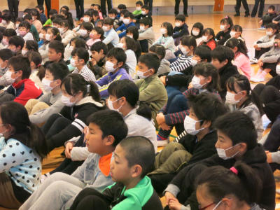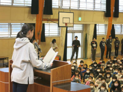 自分の考えがしっかり書かれている作文を全校児童が真剣に聴いています。