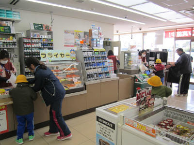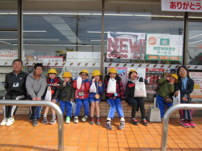 青空のもと、たんぽぽ学級が、近くのお店に買い物に行きました。