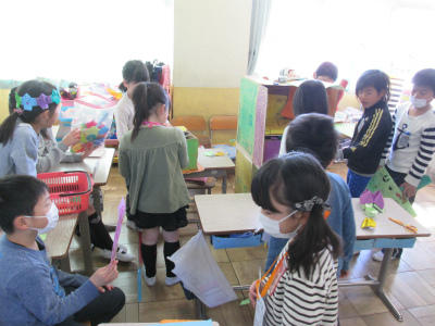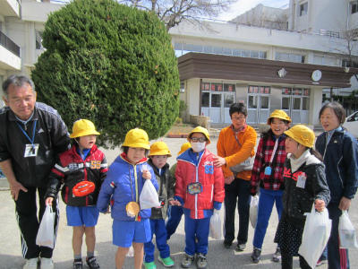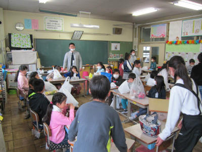 20日、豊野地区見守り活動推進協議会から、卒業を祝っていただいたラナンキュラスの花を6年生に渡しました。