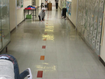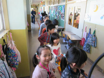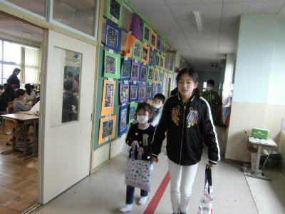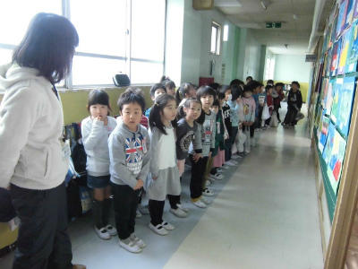 明日の卒業式に出ない1,2,3年生にとって、今日が6年生との最後のお別れです。廊下で6年生を送ります。