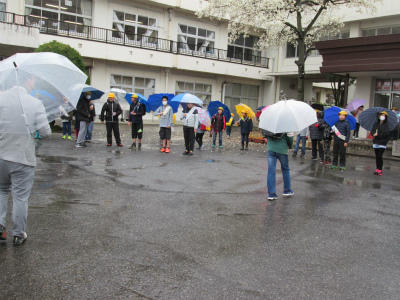 雨上がりの正門で、豊野小元気にあいさつし隊があいさつ運動をしています。
