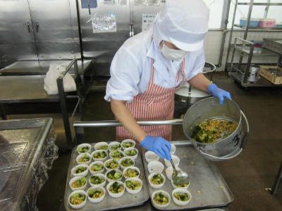 きんぴらごぼうとブロッコリーのソテーを紙カップに入れ、確認しています。
