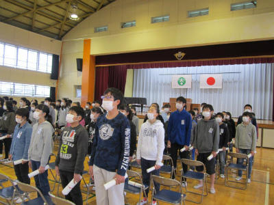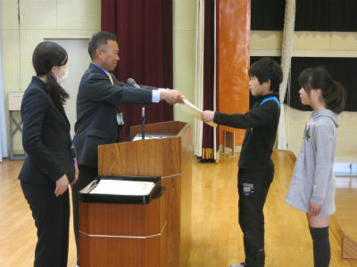 第3学期の修了式が行われました。代表児童が、修了証を壇上で受け取ります。