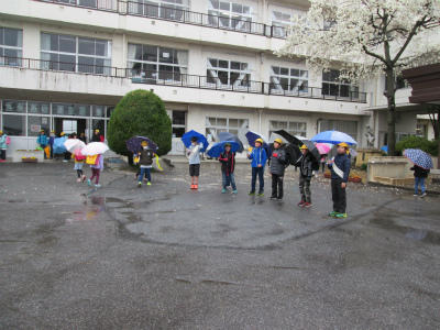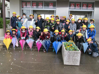 雨上がりの正門で、豊野小元気にあいさつし隊があいさつ運動をしています。