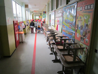 明日の卒業式に出ない1,2,3年生にとって、今日が6年生との最後のお別れです。廊下で6年生を送ります。