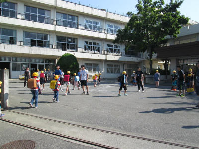 2年生が、まちたんけんに行ってきました。昇降口前の出発の様子です。