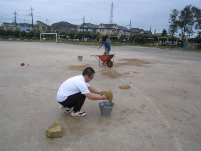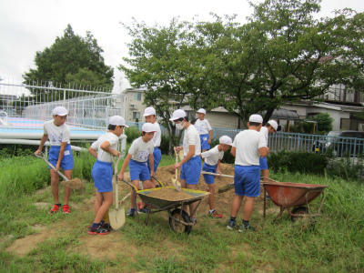 校庭の水たまりやぬかるみを6年生が、土入れしてくれています。