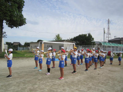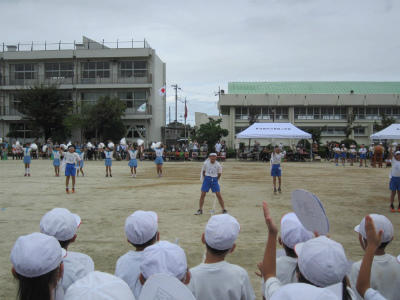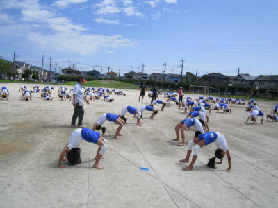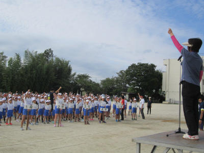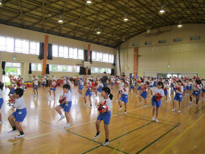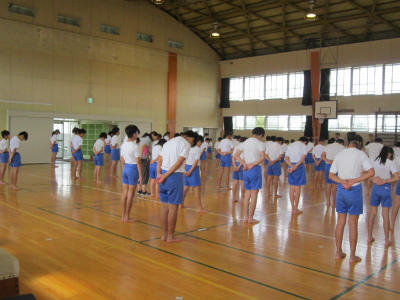 雨のため、今朝の全体練習は体育館で行いました。今日は、開会式の流れに沿った練習でした。