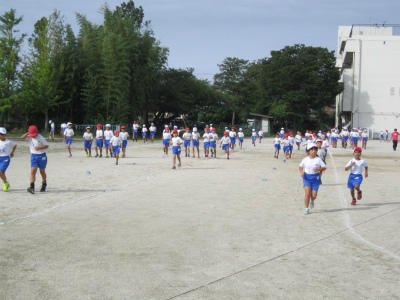 気持ちのよい朝、豊野小の校庭では、子供たちが元気に活動しています。