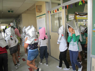 10月の全校朝会は、校長が「こうもりのうんどうかい」の本をスライドで見せながら、読みました。