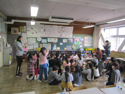 雨が降り出した寒い朝です。教室では、朝の英会話活動が行われています。