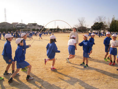 今朝は、どんよりした空模様でしたが、子供たちは元気いっぱいになわとびに取り組みました。
