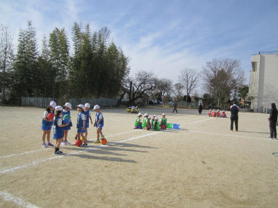 暖かな陽射しの中、子供たちは元気に運動しています。