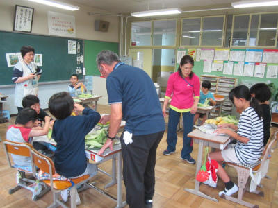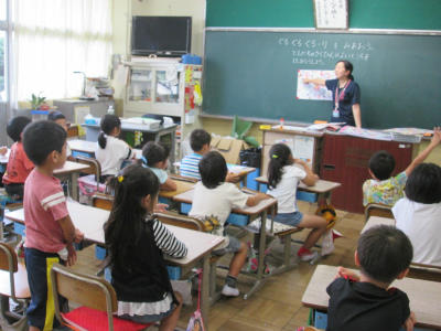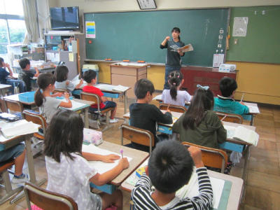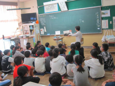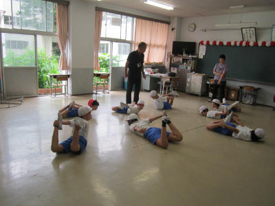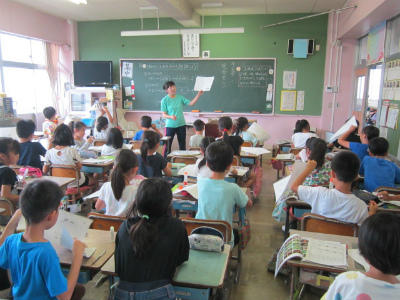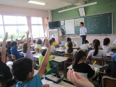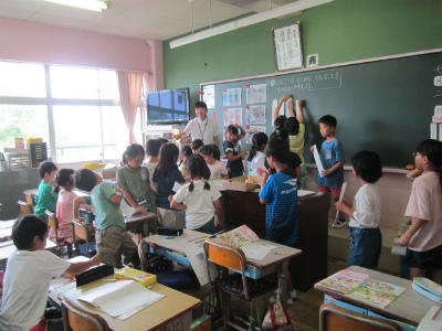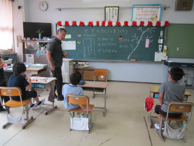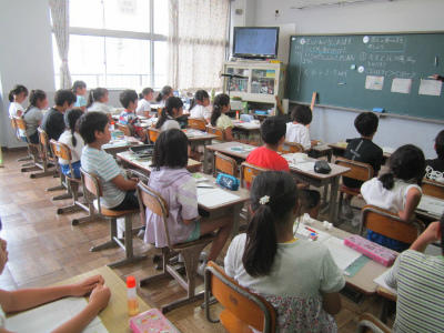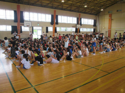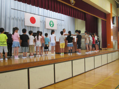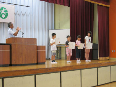 豊野ギネスに輝いた人たちのがんばりに拍手を送り、改めて全員に夏休みに自分の得意を作るよう話しました。