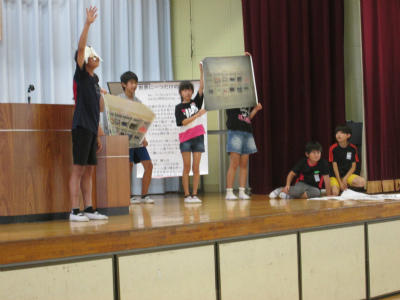今月の生活目標について、子供たちと教師の寸劇です。上手でした。
