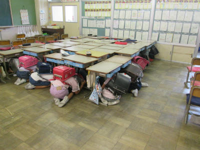 放送を聞き、教師はガラスの破損を広げないようカーテンを閉め、子供たちは、机を窓から離す。さらに、防災頭巾をかぶり、ランドセルを背負い、机の下に潜って身を守る。