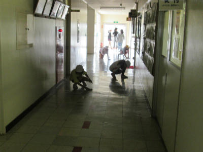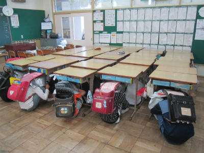 6年生も、大きな体を一生懸命に机の下に入れて避難しています。