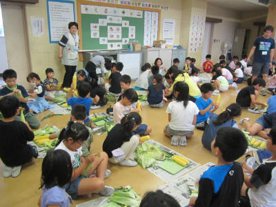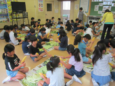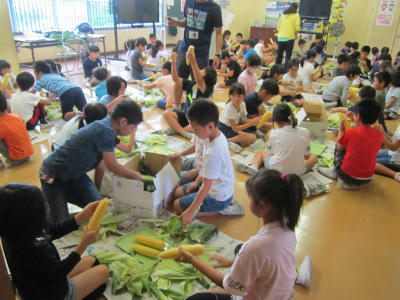 3年生とたんぽぽ学級の子供たちが、とうもろこし皮むき体験を行いました。