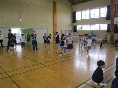 「一緒に踊りましょう」の呼びかけで、踊る子供と