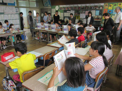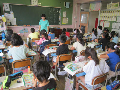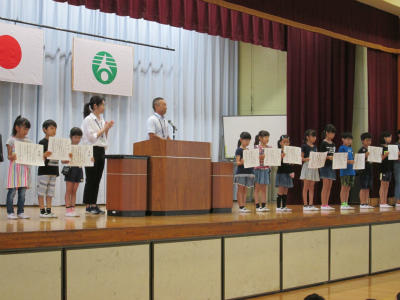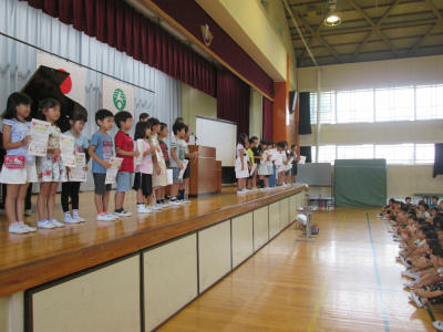 豊野ギネスに輝いた人たちのがんばりに拍手を送り、改めて全員に夏休みに自分の得意を作るよう話しました。
