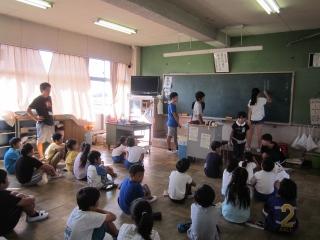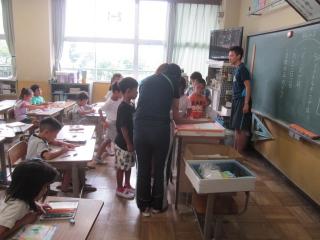 教師や高学年が、低学年の子に教えています。