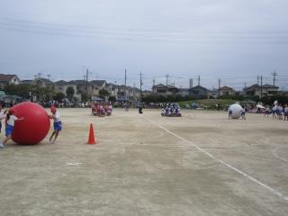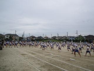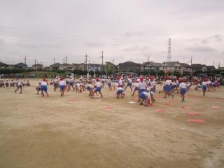 3年生は、「台風の目」。後方では、4年生が、徒競走の走る順番とコースの確認。