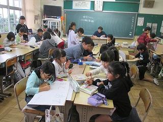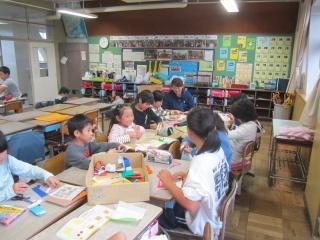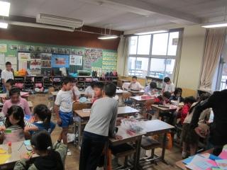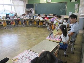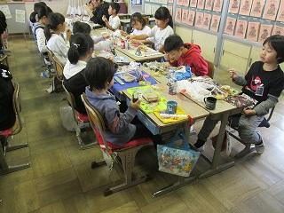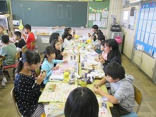 今日の給食は、なかよし集会の縦割りグループで食べる「コスモスランチ」です。