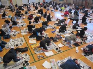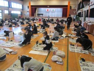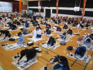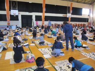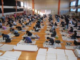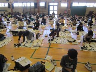 今日は、校内書きぞめ競書会です。体育館で中学年が行っています。