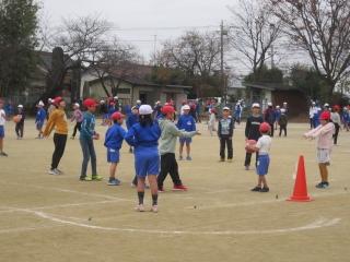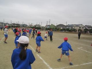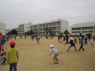 高学年は、利き腕ではない手で投げたり、小さい子にボールを渡してあげたりと、仲よく遊んでいます。
