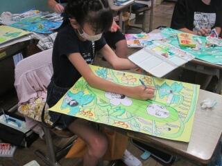 様々なひまわりと楽しそうな子どもたちが描かれました。