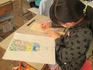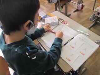 1年生は、ペンを使って「ふじ山」と書きます。
