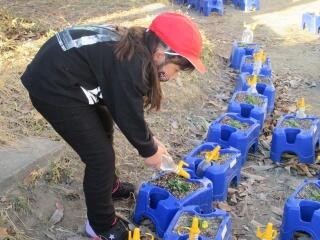 1年生は、毎朝、自分の鉢に水をあげます。
