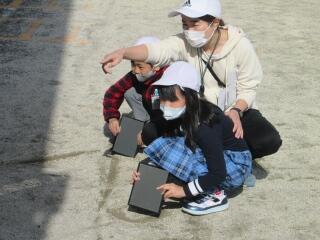 太陽の光を鏡に反射させ、光の進み方を調べました。