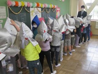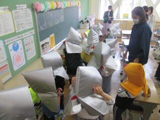 1年生は、防災頭巾の使い方や安全な避難の仕方を学習していました。